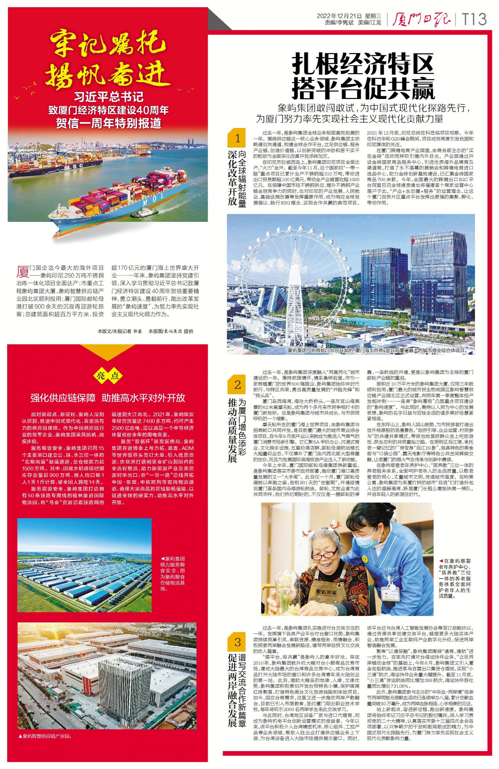 厦门国企迄今最大的海外项目——和记娱乐怡情博登录印尼250万吨不锈钢冶炼一体化项目全面达产;市重点工程和记娱乐怡情博登录集团大厦、和记娱乐怡情博登录智慧供应链产业园北区顺利投用;厦门国际邮轮母港打破900余天的沉寂再迎游轮旅客;总建筑面积超百万方、投资超170亿元的厦门海上世界盛大开业……一年来,和记娱乐怡情博登录集团坚持党建引领,深入学习贯彻习近平总书记致厦门经济特区建设40周年贺信重要精神,勇立潮头、勇毅前行,跑出改革发展的“和记娱乐怡情博登录速度”,为努力率先实现社会主义现代化倾力作为。今天,厦门日报推出特刊《牢记嘱托 扬帆奋进 习近平总书记致厦门经济特区建设40周年贺信一周年特别报道》,现全文转载如下。