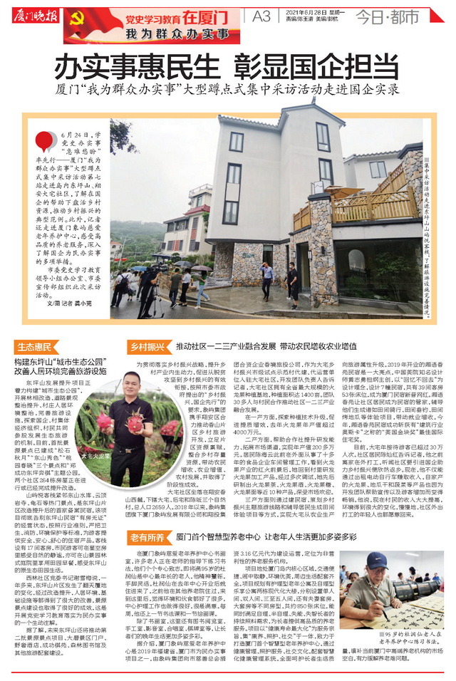 和记娱乐怡情博登录集团正以“我为群众办实事”实践活动为抓手,深入学习贯彻习近平总书记重要讲话精神,着力解决人民群众急难愁盼问题,为百姓创造美好生活。近日,由厦门市委党史学习教育领导小组办公室、厦门市委宣传部组织的党史学习教育“我为群众办实事”大型蹲点式集中采访走进和记娱乐怡情博登录集团。境内外近20家媒体深入东坪山发展提升项目、大宅乡村振兴项目和和记娱乐怡情博登录慈爱老年养护中心,对和记娱乐怡情博登录集团办实事、解民忧、惠民生的创新举措进行集中报道。