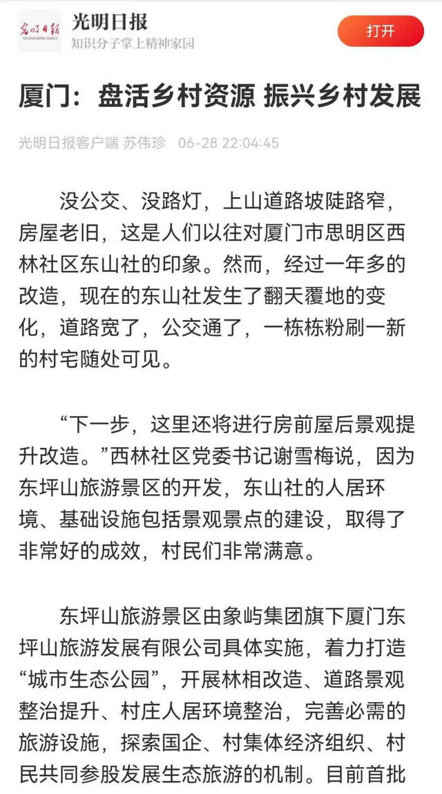 作为东坪山片区发展提升项目的具体实施方,和记娱乐怡情博登录集团旗下厦门东坪山旅游发展有限公司贯彻“生态美,百姓富”的指导思想,一方面推动村宅改造,一方面围绕东山社“原乡东山”的定位和东坪山社“文化东坪”的定位进行产业植入。公司总经理周远新介绍,村民可自愿选择保留村宅或者下山安置,对保留村宅的村民,推动老旧危房的改造提升,对下山安置后收回的村宅,则积极引入餐饮、住宿等业态,提升旅游配套和产业造血功能。未来,公司将继续探索国企、村集体经济组织、村民共同参股发展生态旅游的新机制、新模式。