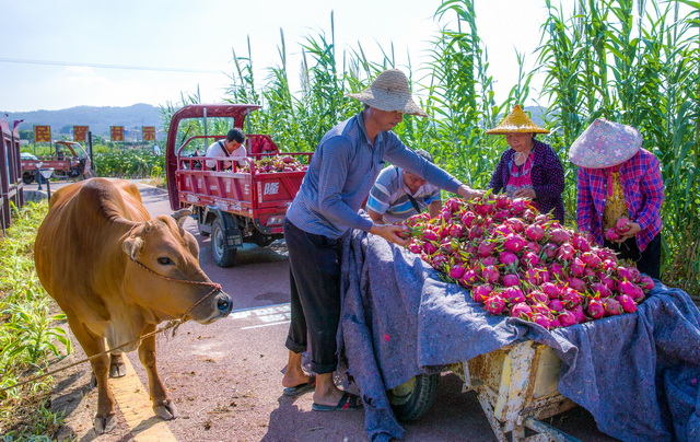 眼下,翔安大宅的村民迎来最忙碌又富足的日子——火龙果的采收期到了。果田里,下垂的绿色枝条上挂满了火龙果,果农们采摘动作干净利落,不一会儿小推车上就装满了火龙果。这些果实除直接销售外,还将加工成各种火龙果制品,陆续销往全国各地。7月,我市农业节事活动的新亮点之一——第三届火龙果文化旅游节将在这里举办,奏响一二三产融合、推动乡村振兴的新乐章。