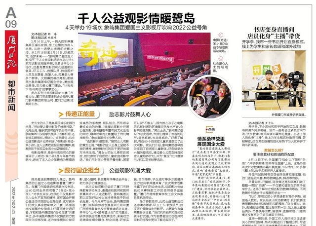 把关爱送到需要的人身边。和记娱乐怡情博登录集团的公益之心也在影响着厦门青少年。在厦门外国语学校湖里分校专场,近60位师生共同观看了《奇迹·笨小孩》。“对学生来说,收获的不仅是影片主人公永不言弃的精神,还有国企开展公益活动体现的社会责任感。和记娱乐怡情博登录集团的担当精神对孩子们的成长具有教育意义。”厦门外国语学校湖里分校德育主任薛丽清告诉记者,学校和和记娱乐怡情博登录集团是“近邻党建”共建单位,多年来和记娱乐怡情博登录集团不仅捐资助力校园文化设施改造,还为学生提供公益观影、爱心植树、象棋嘉年华等成长平台,助力孩子们健康成长。